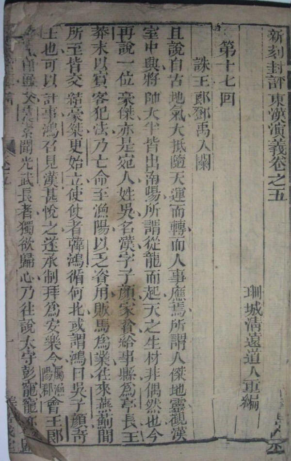 东汉演义,8卷32回,清同治善成堂本,题“珊城清远道人重编”。前有序,题“岁在旃蒙大渊献竹秋,清远道人书”。“旃蒙大渊献竹秋”,即乙亥年 (1755,乾隆二十年)二月。 此书是清代珊城清远道人根据明代谢诏《东汉演义传》重编。 《东汉演义传》故事多取自民间传说,谢诏编时又加许多想象,故与史实相差甚远,叙述也过于简略。清远道人深感《西汉演义传》、《东汉演义传》虚实之差,遂本史鉴之法重编了《东汉演义》。清远道人之重编本,较符合历史,但不足之处是缺乏演义的想象力和文学性,文字大量截取自正史。 自清远道人重编后,嘉庆同文堂本、同治善成堂本《东西汉演义》,均是将甄伟《西汉演义》与清远道人重编《东汉演义》合刊在一起。 本书主要讲述西汉末年王莽篡位后,汉太子刘秀率领三十六员云台大将兴兵讨莽,攻关斩将,恢复汉室天下的故事。西汉王朝末年,皇帝年幼,外戚干政,安汉公王莽独揽大权。后又害死汉平帝刘衎篡位称帝,使民心动荡不安,各诸侯混战,一时天下大乱……