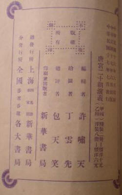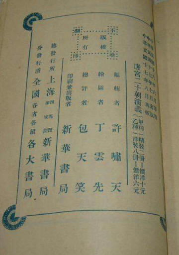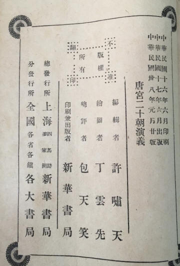 ↑《唐宫二十朝演义》民国16年6月印刷,民国17年6月出版,民国17年7月发行